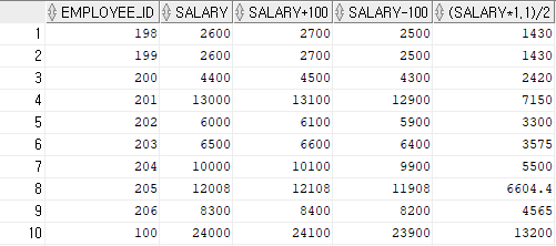 SELECT employee_id, salary, salary+100, salary-100, (salary*1.1)/2