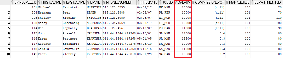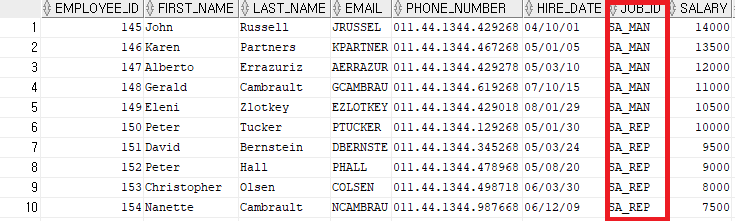 위와 같이 조회할 경우 job_id가 SA'로 시작하는 값들을 모두 불러온 것을 확인할 수 있습니다.