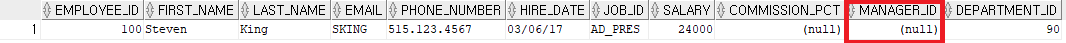 manager_id 컬럼에 해당하는 값이 존재하지 않는 데이터를 조회해본 결과는 위와 같습니다. 추가적으로 null이 아닌 값들만을 조회하고 싶다면 NULL 앞에 NOT을 붙인 IS NOT NULL을 사용할 수 있습니다.