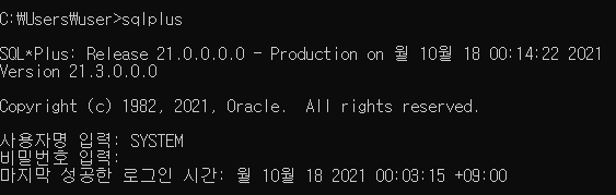 그리고 cmd 창을 실행한 뒤 sqlplus를 실행해주고 SYSTEM 사용자로 로그인 해줍니다.