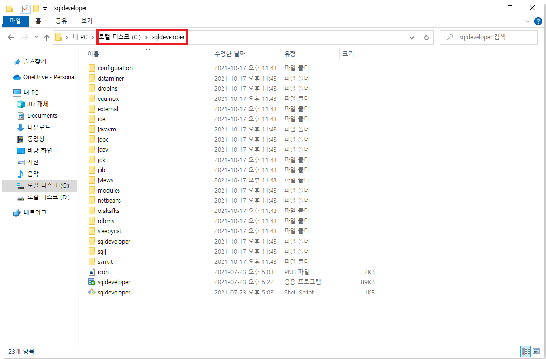 다운로드 받은 압축 파일을 압축 해제 해준 뒤, 폴더 안의 sqldeveloper 폴더를 C드라이브 아래로 옮겨 줍니다.
