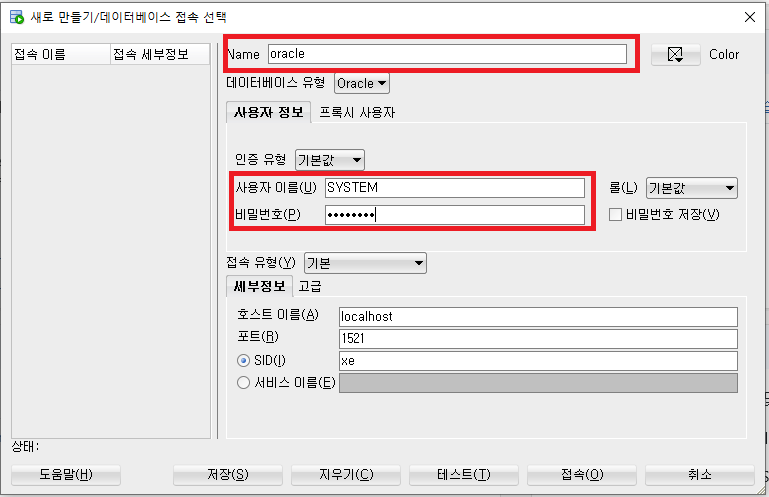 접속이름, 사용자이름, 비밀번호를 입력해줘야 합니다. 임의대로 작성을 해도 되지만 저의 경우에는 접속 이름은 oracle 사용자이름은 SYSTEM, 비밀번호는 Oracle Database Express 설치 시점에 설정한 비밀번호를 입력했습니다.