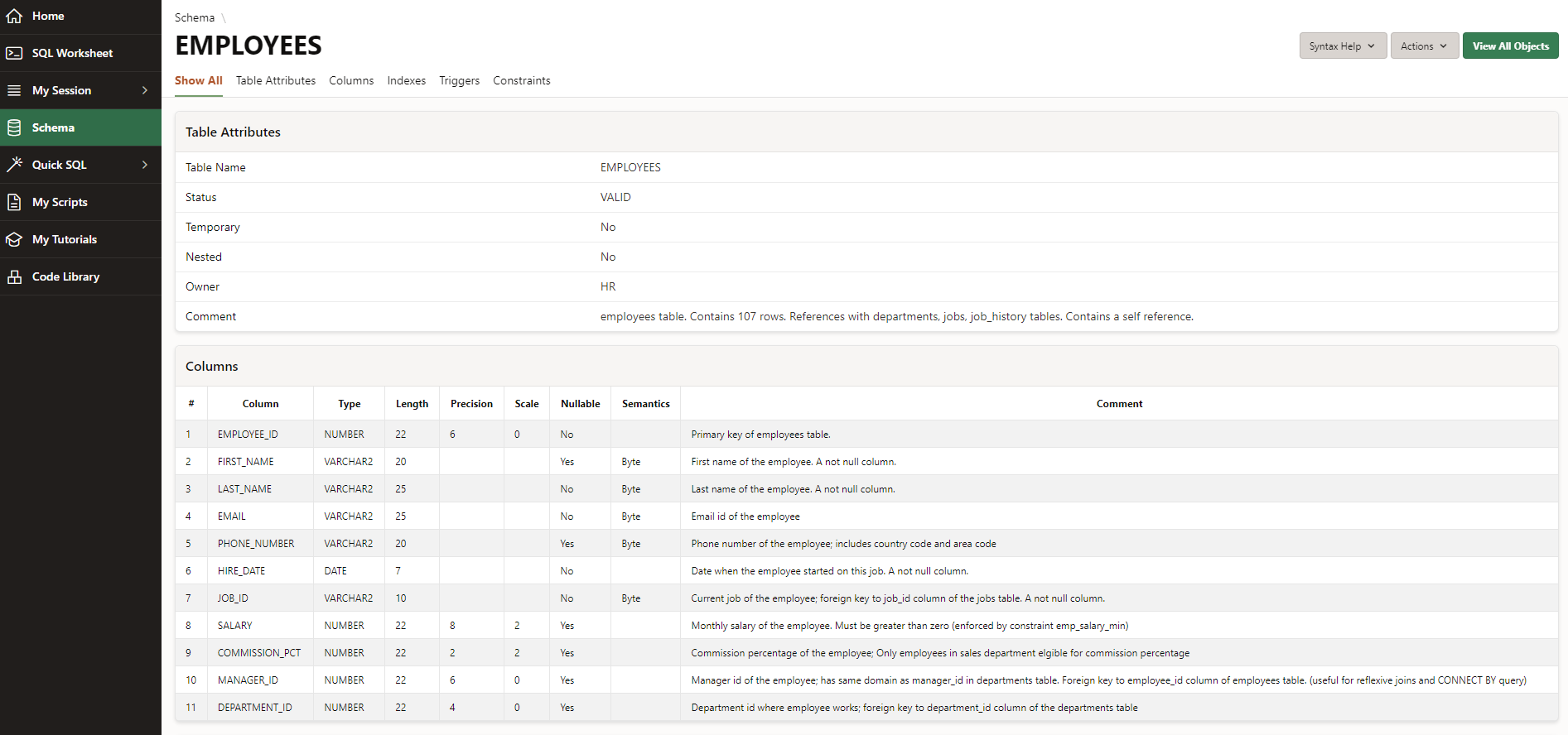 빈번하게 사용되는 HR 스키마의 Employees 테이블의 정보를 아래와 같이 확인해 봤습니다.