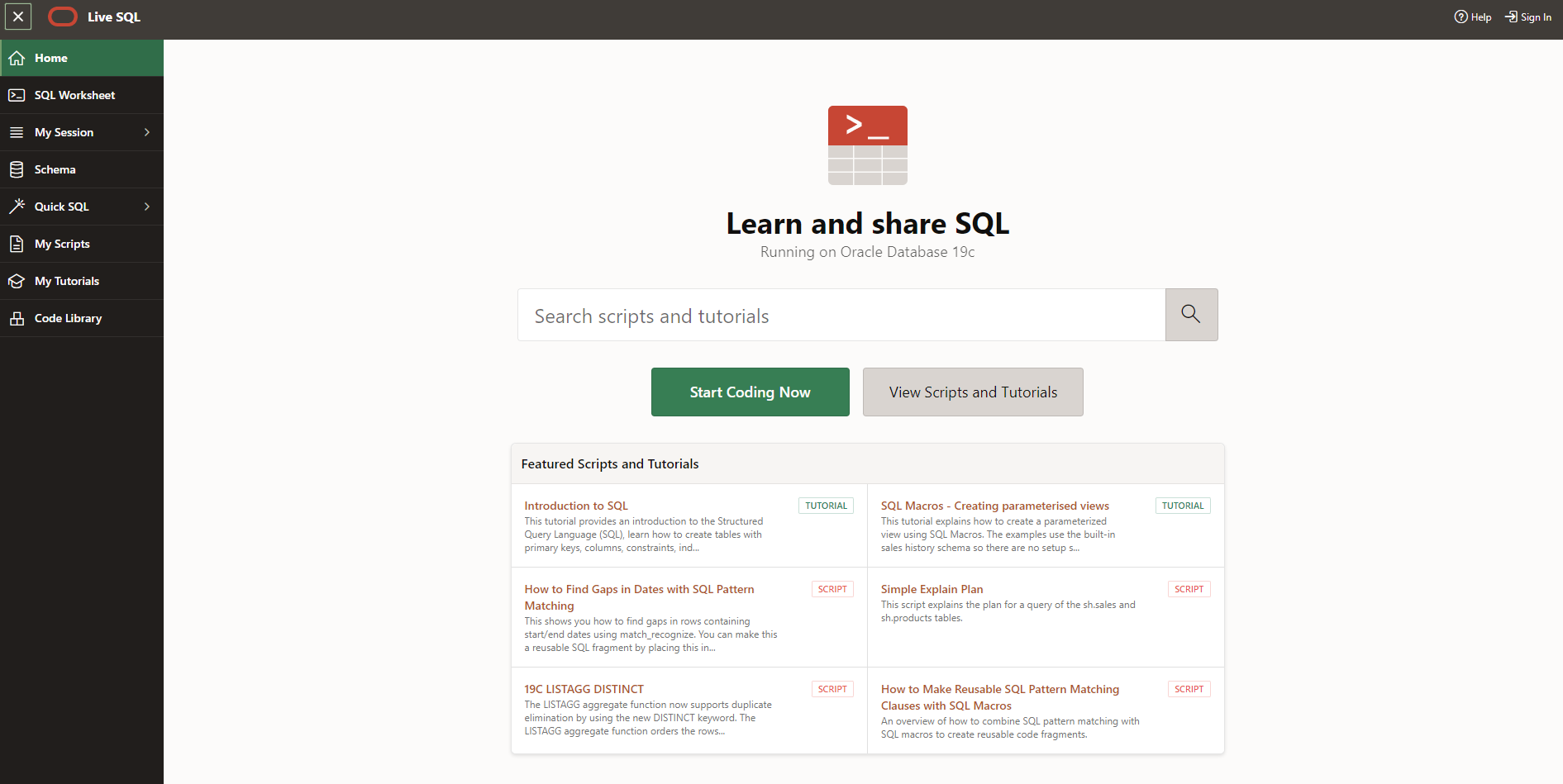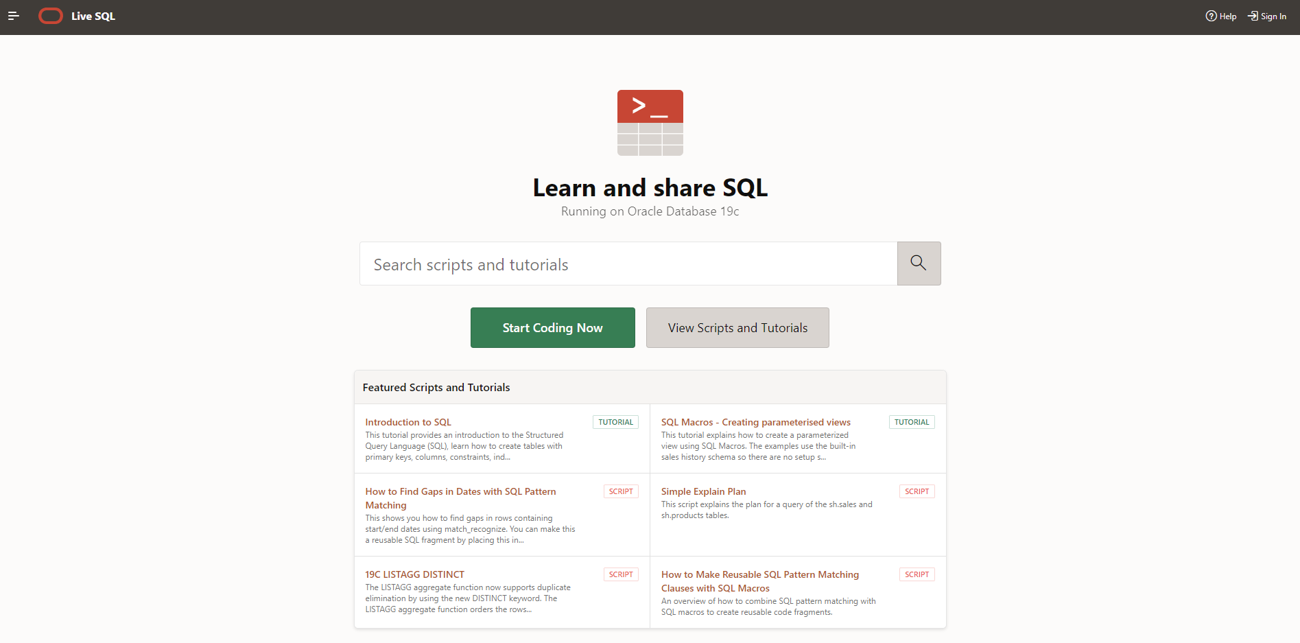 Oracle Live SQL 이라는 사이트 입니다. (링크를 누르시면 해당 사이트로 이동합니다) Oracle에서 웹사이트를 통해 SQL을 사용할 수 있도록 만든 사이트이고 이를 이용해서 Oracle을 로컬 PC에 다운로드 및 환경 설정을 하지 않아도 Oracle SQL을 자유롭게 사용할 수 있습니다.