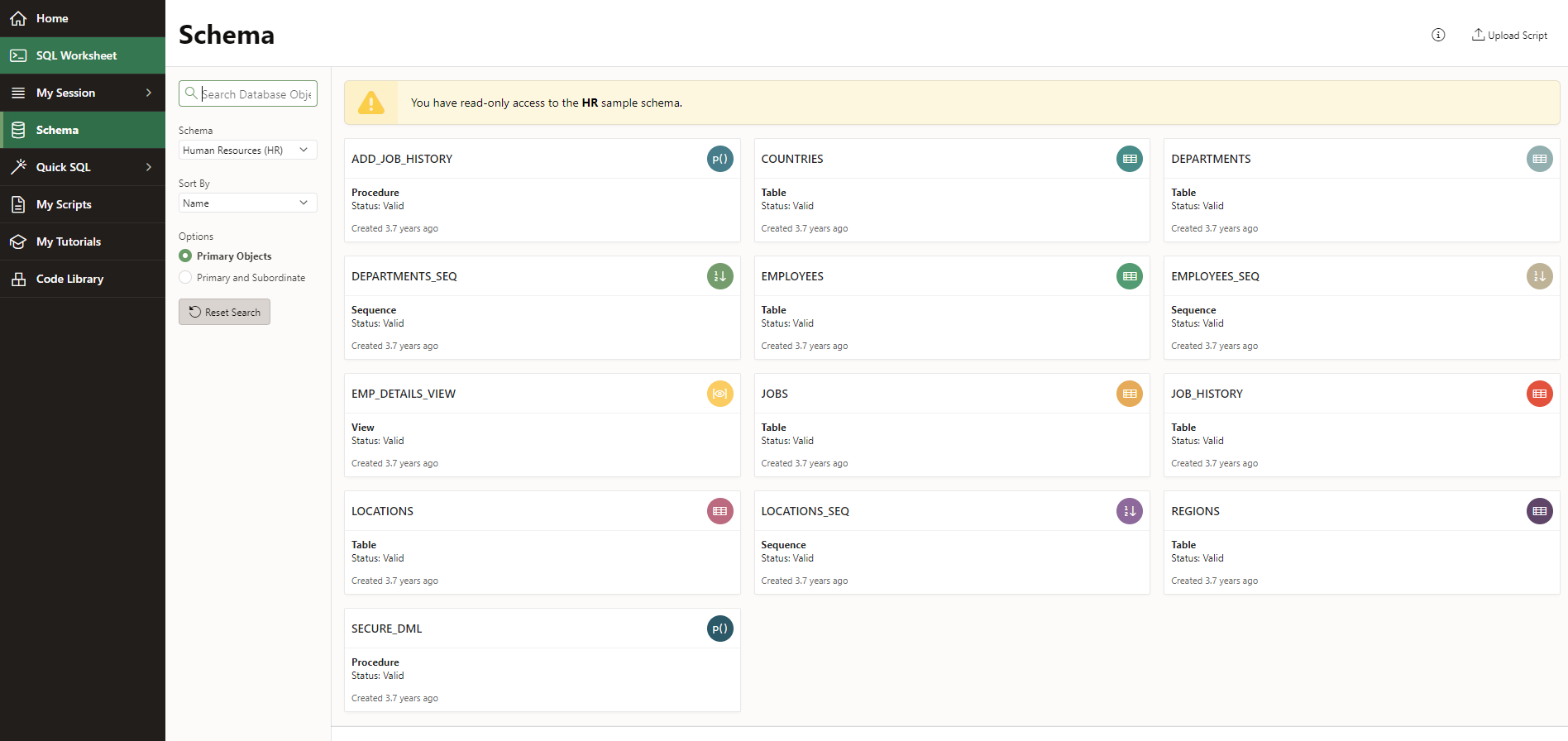 Schema 메뉴를 누르면 기본으로 Oracle 에서 제공하는 Schema 정보와 그 안에 저장되어있는 테이블 정보를 확인할 수 있습니다.