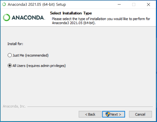 Just Me에 기본으로 체크가 되어 있는데 이거를 All Users 로 변경해준 뒤 Next 버튼을 눌러 줍니다. 추후에 작업하다 보면 관리자 권한으로 실행하는 경우가 많기 때문에 되도록이면 All Users 설치를 권장 드립니다.