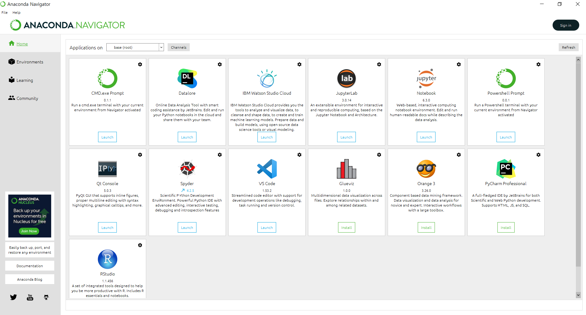 Anaconda Navigator에서는 위와 같이 Python 구동에 필요한 여러가지 프로그램들을 실행할 수 있도록 환경을 지원해 줍니다.