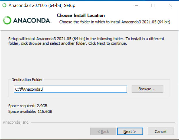 아나콘다가 설치 될 경로를 지정해줍니다. 기본 셋팅은 C:\ProgramFiles\Anaconda3 으로 나올텐데 저는 경로를 C드라이브 바로 밑에 폴더를 새로 생성해서 설치를 진행해줬습니다.