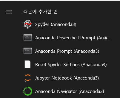 아나콘다 설치가 완료되면 위와 같이 최근 추가한 앱에 여러개의 프로그램이 설치 된 것을 확인할 수 있습니다. 이 중에서 맨 아래에 있는 Anaconda Navigator를 클릭해 줍니다.