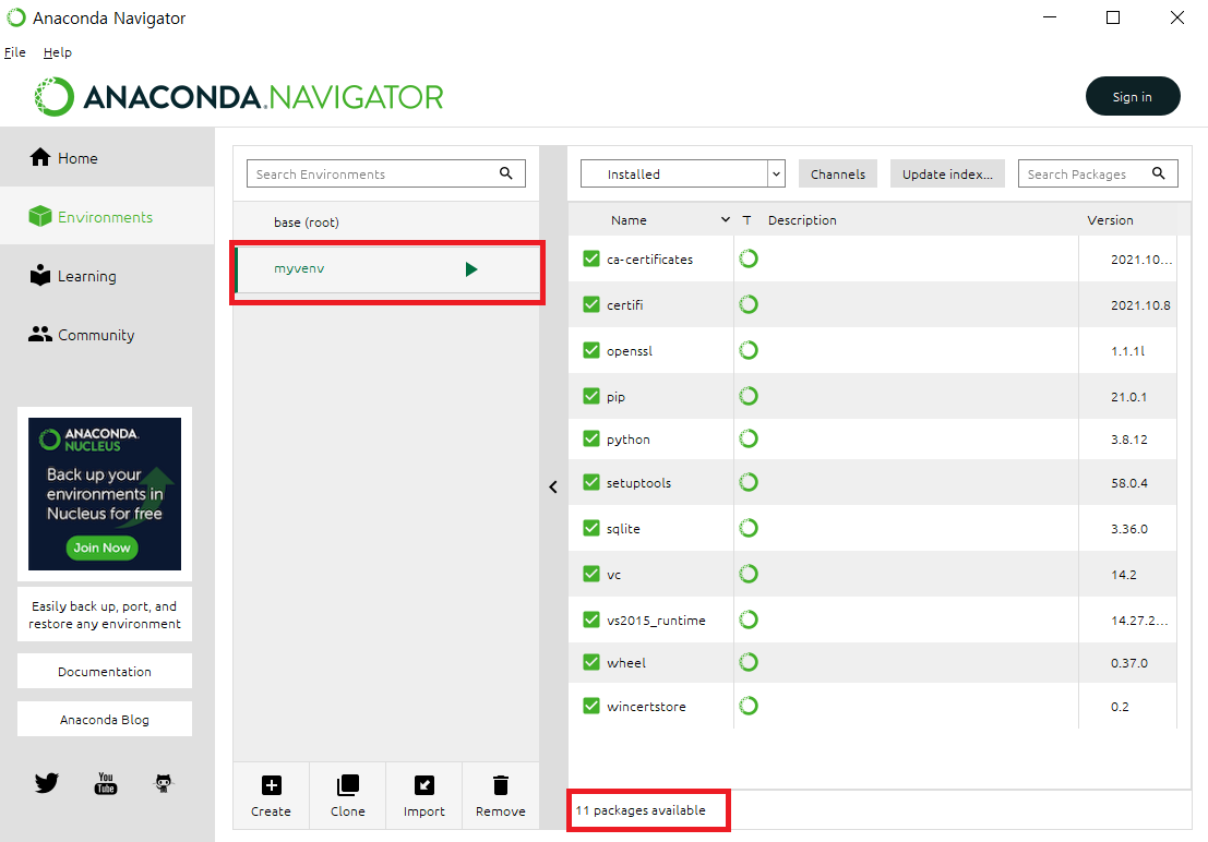 base(root) 환경 외에 새로 생성한 가상환경이 정상적으로 생성되었음을 확인할 수 있습니다. 기본적으로 이렇게 생성된 가상환경에는 11개의 기본 package만 설치되게 되며 나머지 필요한 package는 가상환경 내에서 직접 설치해줘야 합니다.