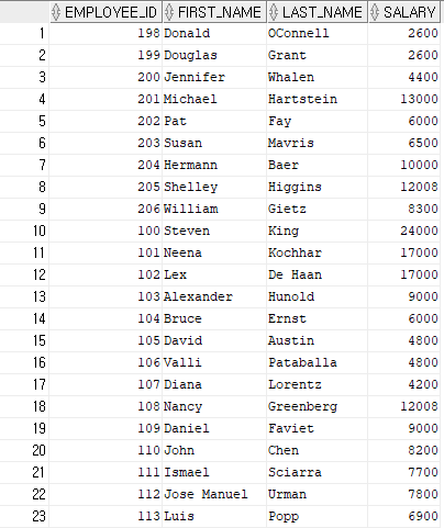 employees 테이블에서 employee_id, first_name, last_name, salary 열만 선택해서 조회한 아래와 같습니다.