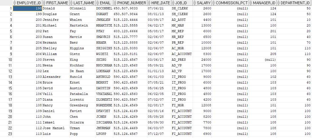 Oracle의 HR 계정 안에 있는 employees 테이블을 기준으로 조회해보면 결과는 아래와 같습니다.